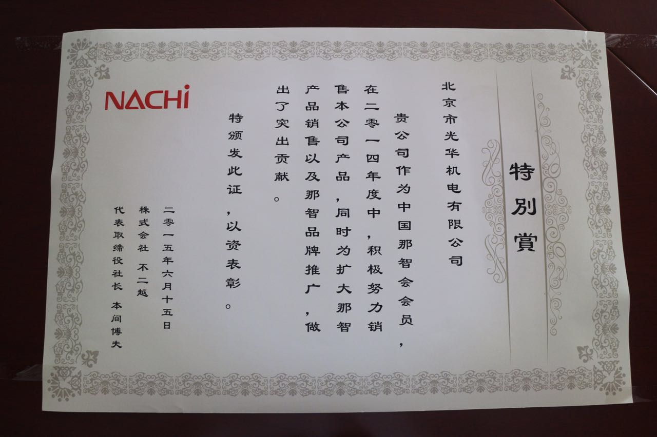 隨著中國(guó)工業(yè)智能化發(fā)展,我司利用自身客戶資源,自2014年起,全面代理日本株式會(huì)社不二越 NACHI品牌:液壓設(shè)備、切削刀具、工業(yè)機(jī)器人等產(chǎn)品。成為NACHI 品牌綜合代理商,促使光華機(jī)電向多元化產(chǎn)品結(jié)構(gòu)發(fā)展。