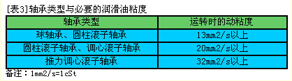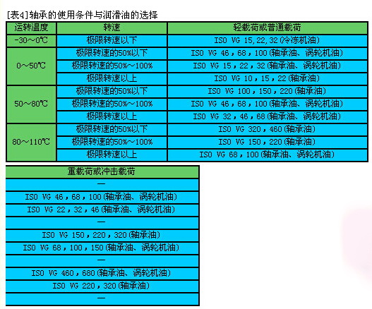 2.油潤(rùn)滑油潤(rùn)滑方法有油浴、滴油潤(rùn)滑、飛濺潤(rùn)滑、循環(huán)供油、噴射潤(rùn)滑、油霧潤(rùn)滑以及油氣潤(rùn)滑。與脂潤(rùn)滑相比,油潤(rùn)滑適合于高速高溫環(huán)境下使用。特別是需要向外部散熱時(shí),采用油潤(rùn)滑更為合適。對(duì)油潤(rùn)滑來說,由于要考慮軸承的運(yùn)轉(zhuǎn)溫度,因此選擇適當(dāng)粘度的潤(rùn)滑油十分重要。一般情況下,轉(zhuǎn)速越高,使用的潤(rùn)滑油粘度越低,載荷越大,使用的潤(rùn)滑油粘度越高。在普通使用條件對(duì)應(yīng)的運(yùn)轉(zhuǎn)溫度下,潤(rùn)滑油的粘度基準(zhǔn)參見[表3] 作為選擇時(shí)的參考,[表1]給出了潤(rùn)滑油的粘度與溫度的關(guān)系。[表4]給出了按軸承使用條件選擇潤(rùn)滑油的例子。